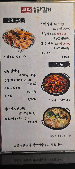 메뉴는 숯불 닭구이 ~ 철판 닭갈비 ~닭수육 전골 이 메인요리